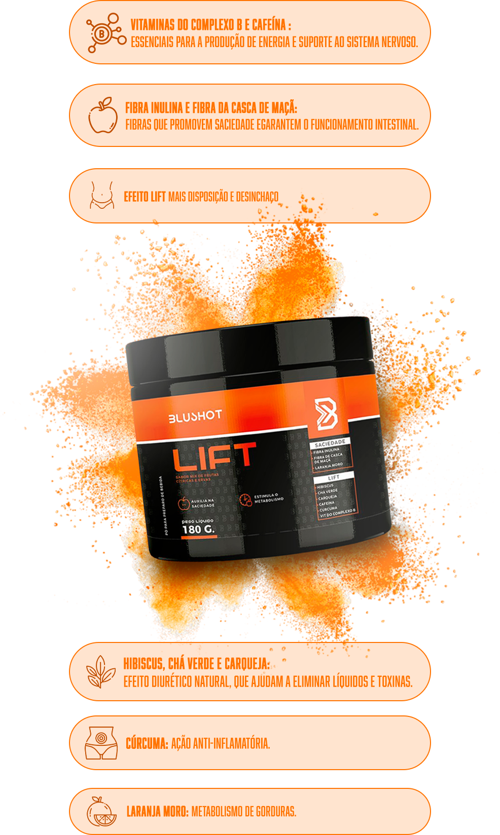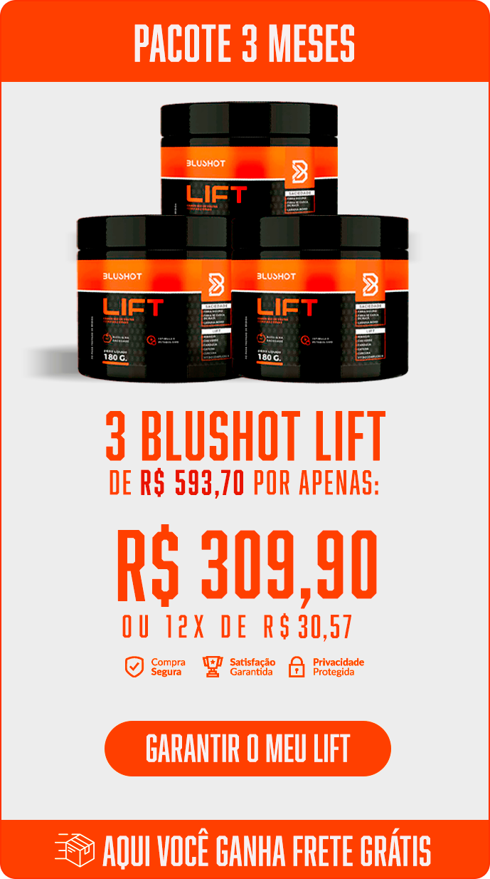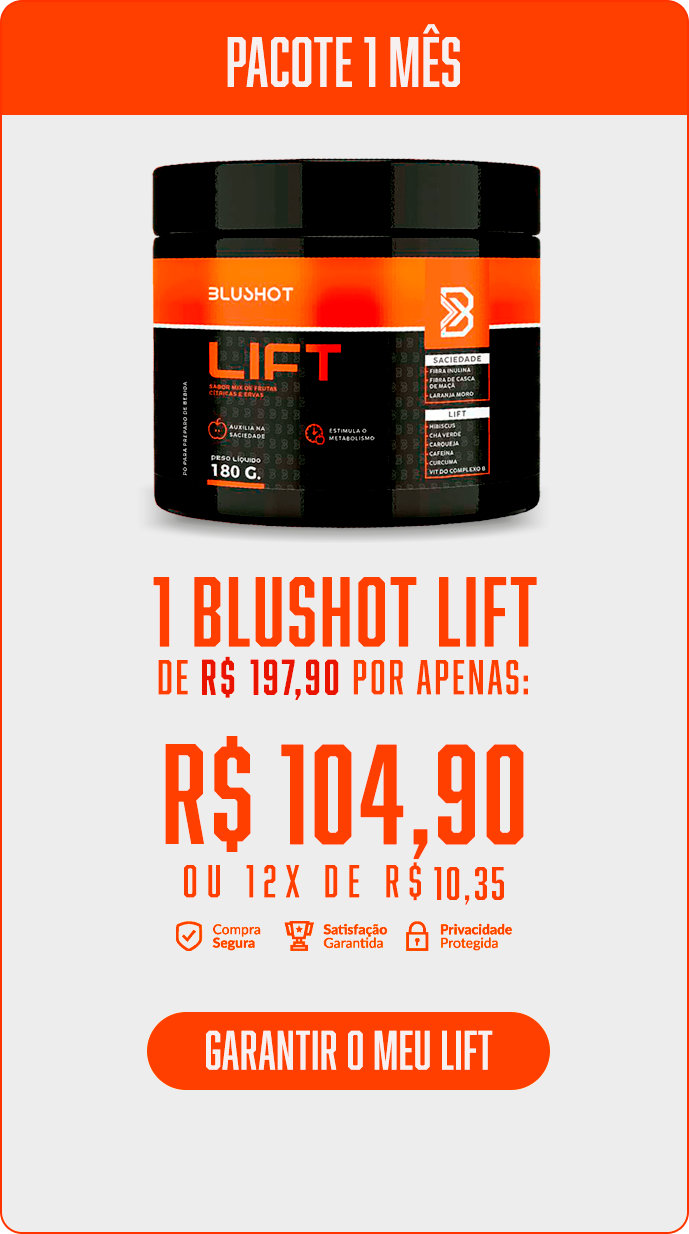O Blushot Lift é um suplemento desenvolvido para quem busca mais energia, foco e saciedade no dia a dia. Sua fórmula auxilia na redução do apetite, aceleração do metabolismo e melhora do desempenho físico e mental.
